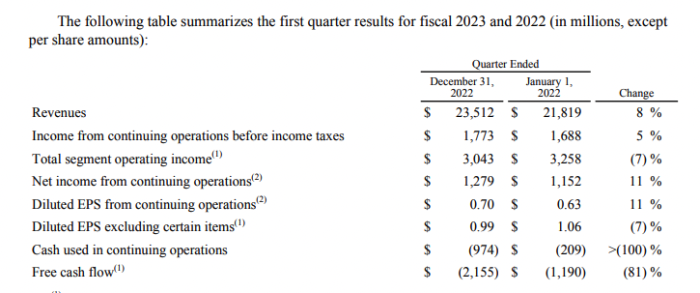 Below you can see a chart of the first quarter of fiscal year 2023 (the quarter that they’re reporting on now) versus the same quarter in 2022. Compared to the prior year quarter, there were increases in many areas, but things didn’t go quite as well (compared to the prior year quarter) for the total segment operating income, and diluted EPS excluding certain items.