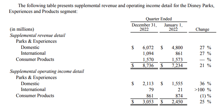 When it comes to the Disney Parks, Experiences, and Products division, things had been going significantly better than the streaming world recently. In November of 2022, we saw that the Parks, Experiences, and Products division had a total revenue of $7.4 BILLION, significantly up from the same quarter in 2021.