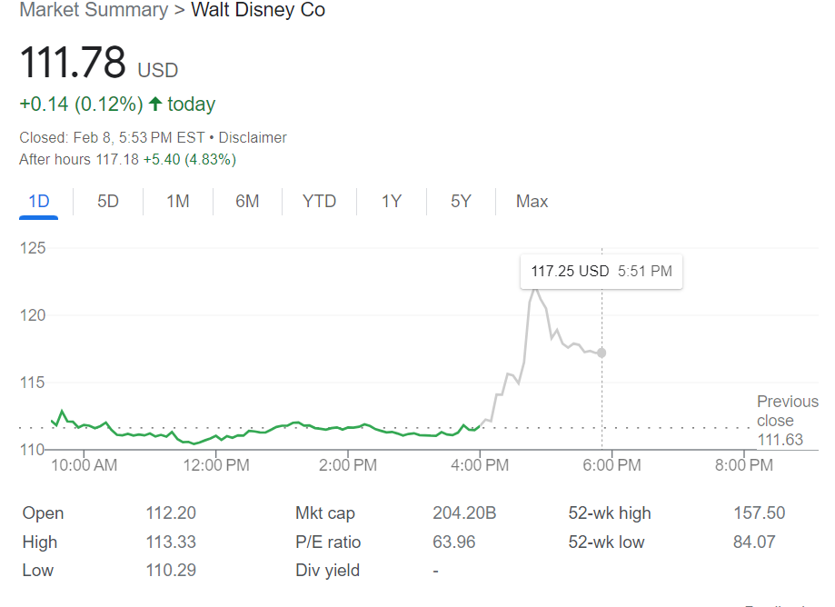 Disney’s stock price jumped 4.88% in after hours trading, to $117 — a signal that investors were pleased with the Q1 earnings report.