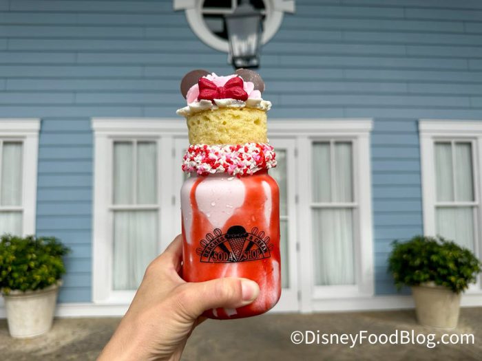 This delicious classic milkshake is a strawberry milkshake with strawberry purée, red sprinkles, and a Minnie Mouse vanilla cupcake. If you love strawberries and enjoy keeping things simple, this is the treat for you!
