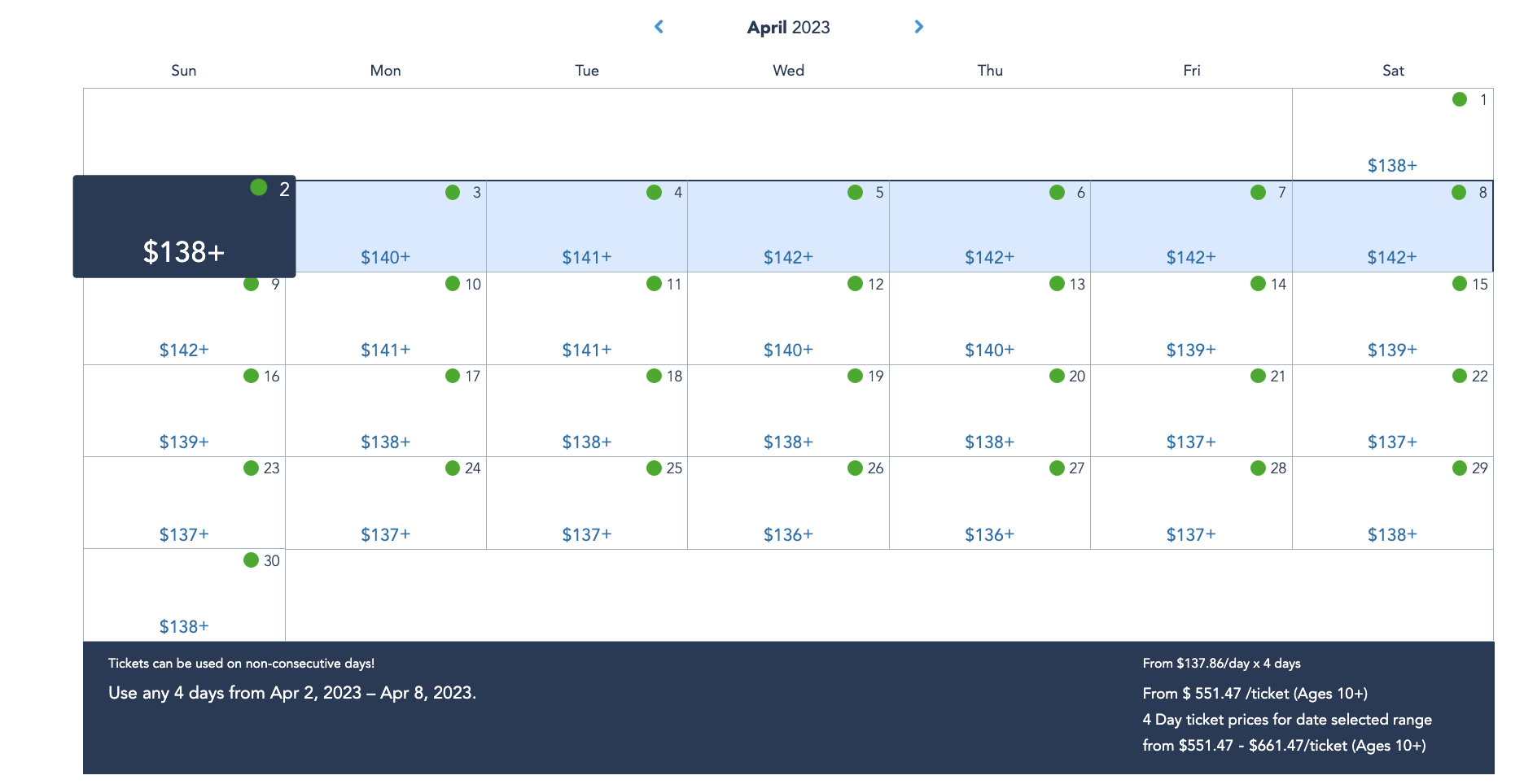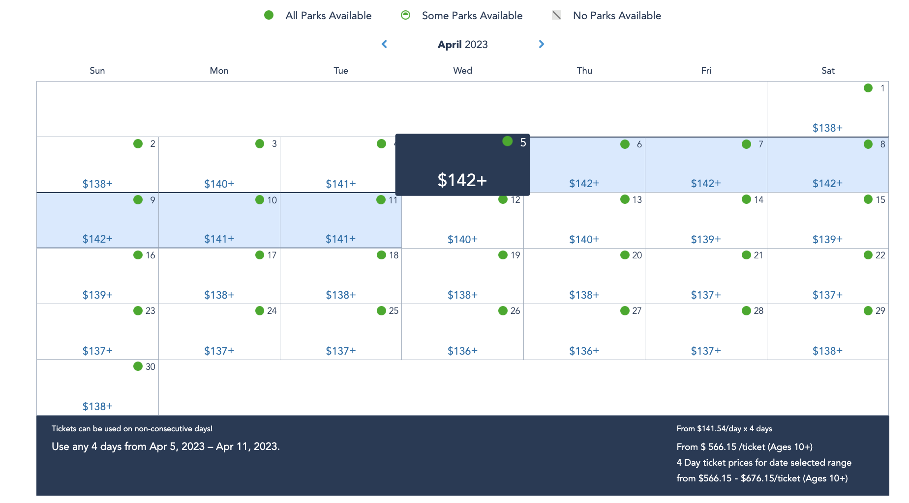 Why is that important? Well, if you play around with the start date, you could get some savings! For example, let’s say the days you actually want to go to the parks are April 5th, 6th, 7th, and 8th. If you select the 5th as your start date (and pick a ticket that gives you access to 1 park per day), the price starts at $566.15 per ticket.