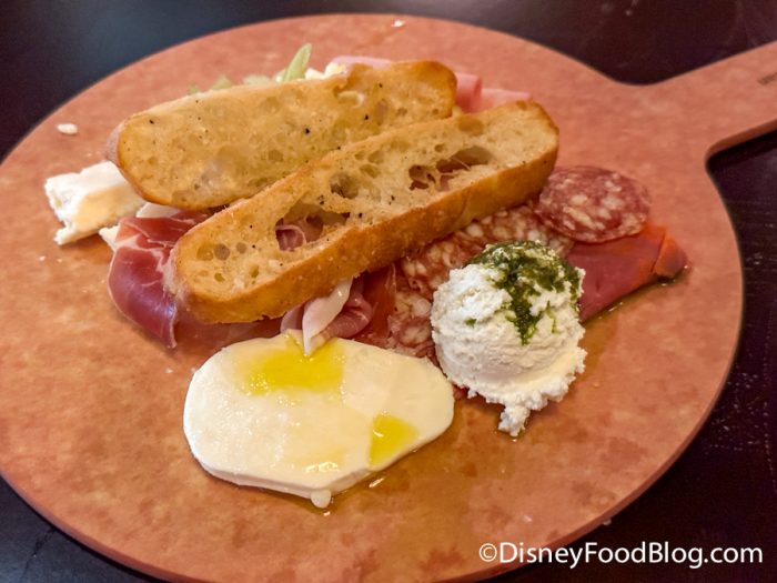 Here you’ll find regional Italian specialties with many of the ingredients made in-house. Yes, that even means the mozzarella is made on-site! We suggest you sample that mozzarella by ordering the Charcuterie Board for $15, which was a selection of Cured Meats, Cheeses, and Pickled Garden Vegetables, served with Ciabatta Bread. The mozzarella was soft and milky, with a delicate sweetness.