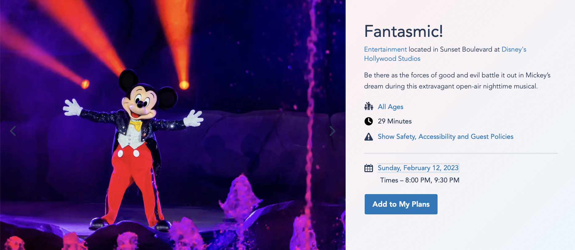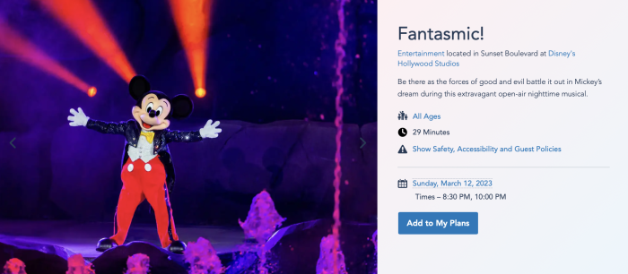 From March 12th through April 1st, Fantasmic! showtimes are at 8:30PM and 10PM. From April 2nd to April 13th, there is only one showtime again at 8:30PM. It is possible that an extra showtime will be added later — we’ll be sure to let you know!