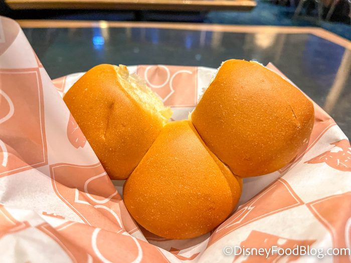 And as a little bonus, you also get a complimentary bread service here! Our server brought the bread out a little late, but made up for it by bringing us a Mickey-shaped surprise. 😉