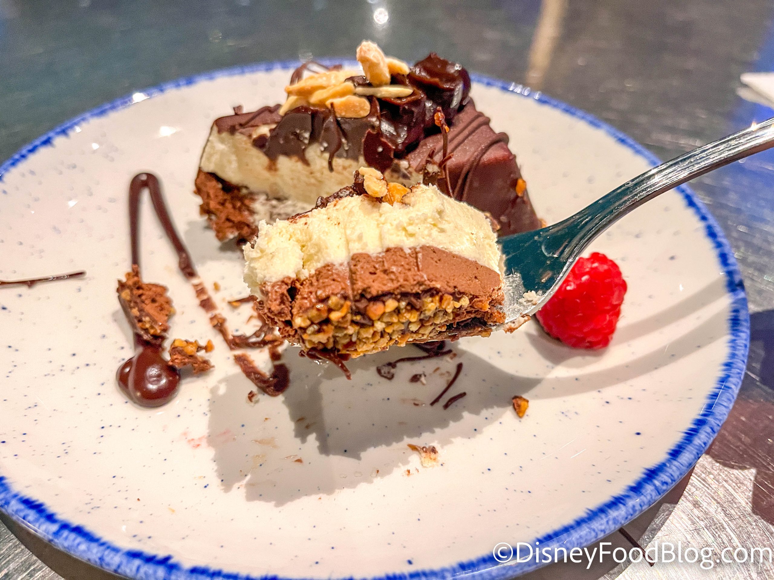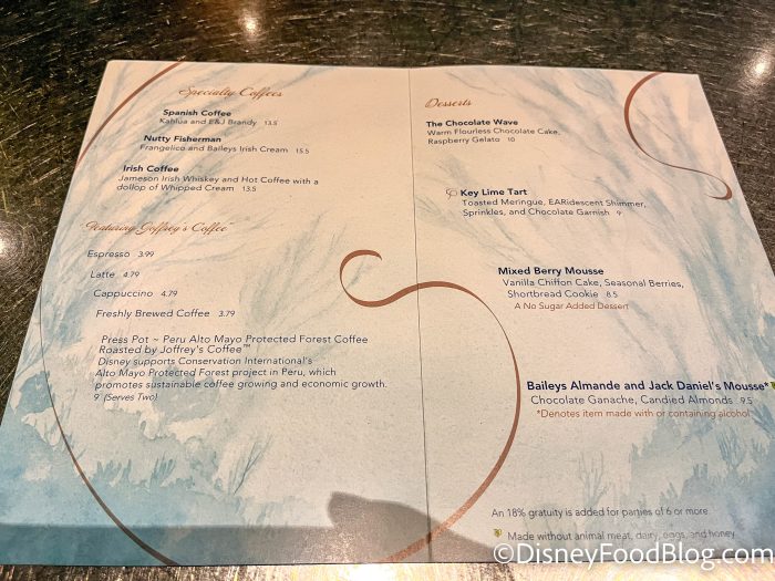 There are four desserts as well. (Honestly, the menu here is pretty small compared to some other Disney restaurants we’ve been to.) You can get the Key Lime Tart, Baileys Almande and Jack Daniel’s Mousse, The Chocolate Wave, or the Mixed Berry Mousse to cap off your meal.