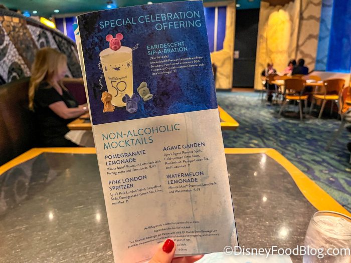 First of all, we got a drink menu. There are plenty of cocktails to choose from, as well as a selection of non-alcoholic mocktails for those who don’t drink alcohol. Like other sit-down restaurants in Disney World, they also have wine and beer.