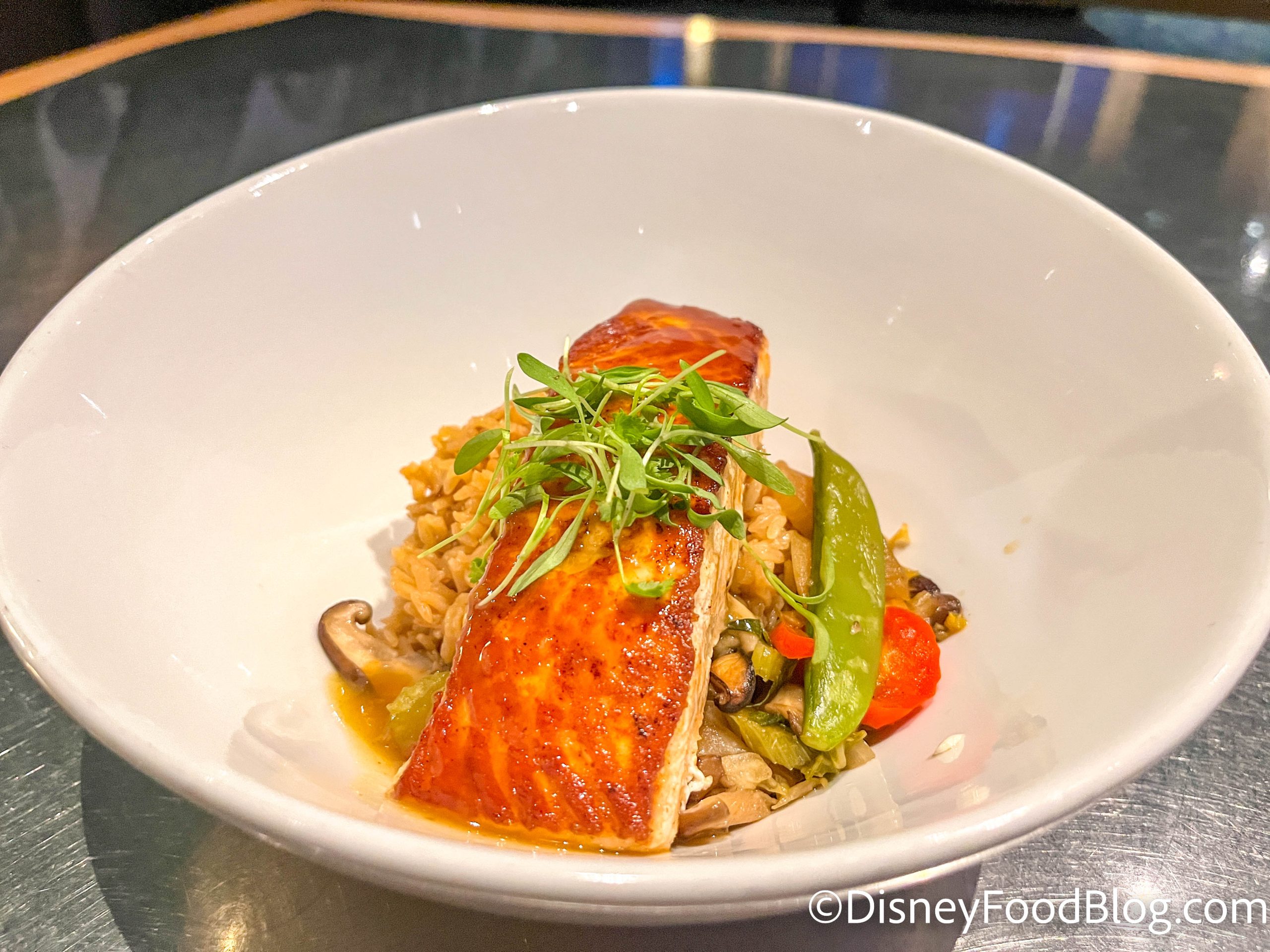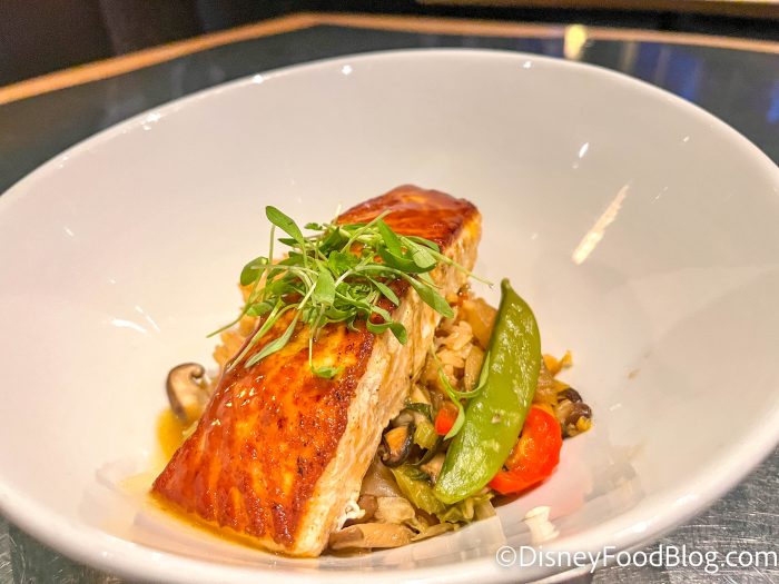 Now time for the main course! We ordered the Orange-glazed Sustainable Salmon, which is $29. It comes with a vegetable stir fry and shiitake sticky rice.
