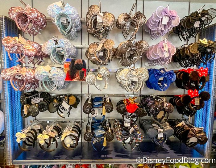 In Tokyo Disneyland, we happened upon a gift shop with quite the impressive selection of headwear! Like the U.S. parks, they’ve got quite a few pairs of Minnie ears, but they’ve also got a variety of hats and other headbands that we’ve never seen here.