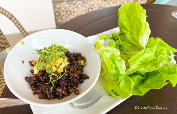 On to the eats! We were only stopping in for a quick rest, so our two reporters split a small plate — the Vietnamese Twice-cooked Beef Lettuce Wraps for $16.