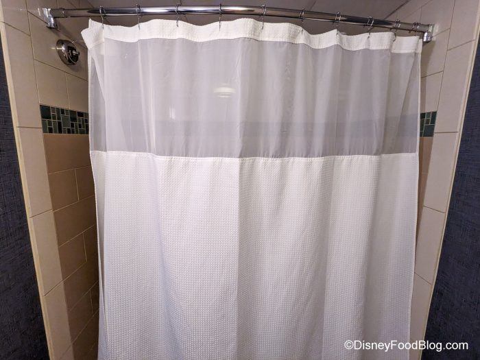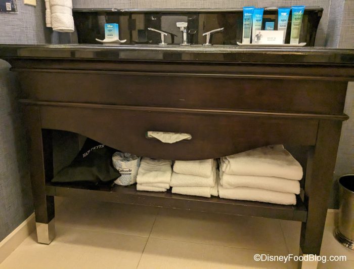 Beside that hangs a hand towel and washcloth. You’ll also find an outlet here to plug in things like the hairdryer.