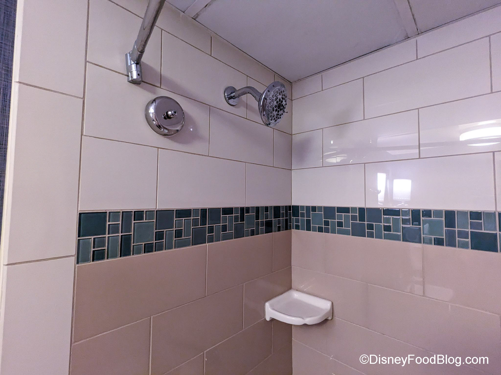 The showerhead is also pretty standard with another holder for your soap or amenities in the corner.