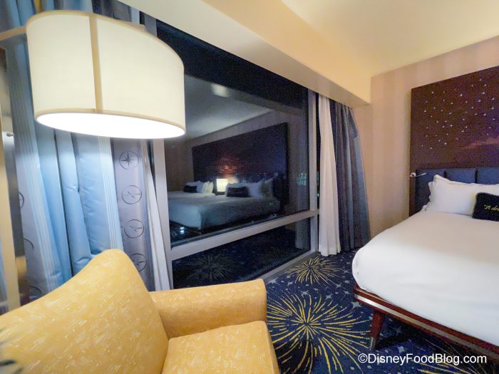 Okay, let’s back out of the bathroom and take a look at the rest of the room. We had two queen beds. CHECK OUT THAT HEADBOARD. It’s got fireworks on it.