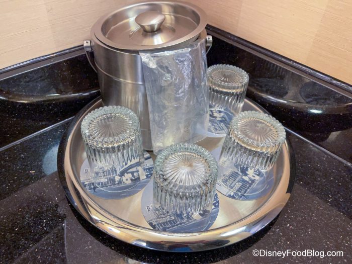 You’ll find a tray with glasses and an ice bucket, as well as…