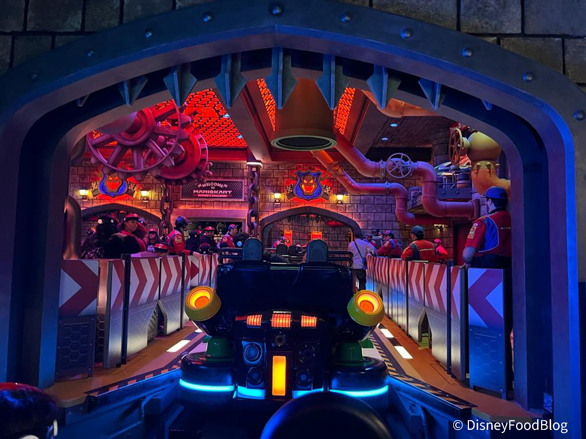 Check out this impressive Bowser Castle! This leads you in to the final queue area before getting your goggles and hopping onto your ride vehicle.
