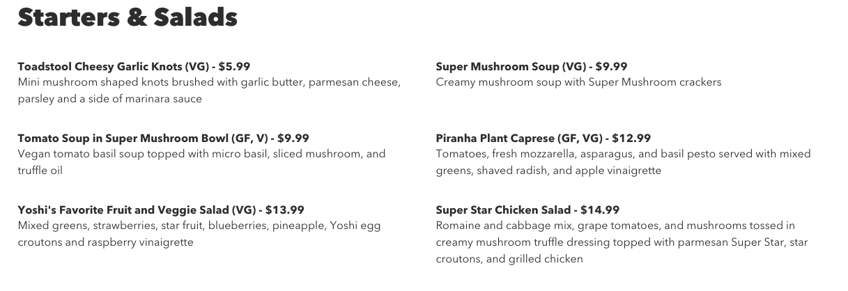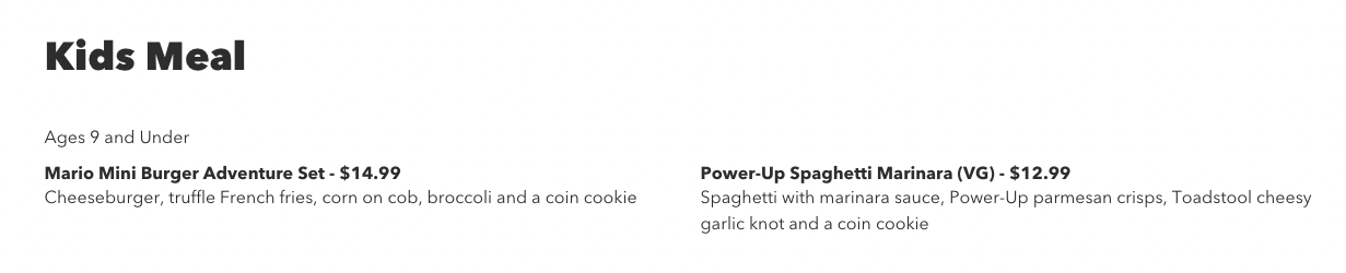 - You want more variety. The menu here isn’t that large and you’re bound to find something with more variety outside of Super Nintendo World.