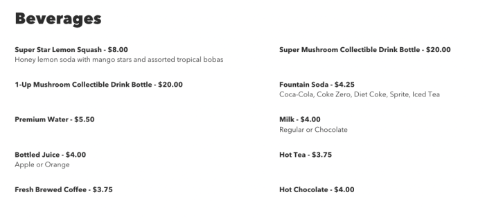 And finally, there are a variety of drinks to choose from here, and you’ll be able to get a few collectible drink bottles here, too (those are $20 each).