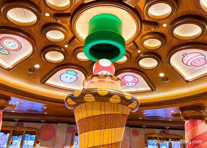 In the next room, you’ll find more queues. You’ll be directed to a numbered queue that you’ll need to stand in to order. After that, it’s time to head into the main dining space, which is also pretty epic. The dining room is full of warp pipes, mushroom details, and rounded architectural elements to put you into the video game world.
