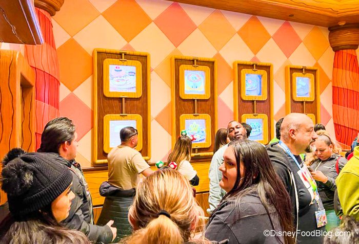 On a side wall, you’ll also see screens with images of the various food items you can order here (we’ll get to that full menu in a second!). As you spend time in this room, take time to listen to the sweet little music playing in the background and listen for Toad’s statements to the group! You’ll also want to look for hidden details.