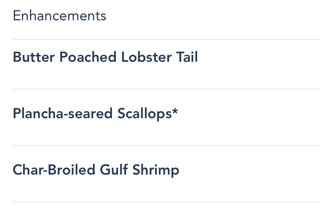 Enhancements are also available — including a lobster tail or shrimp.