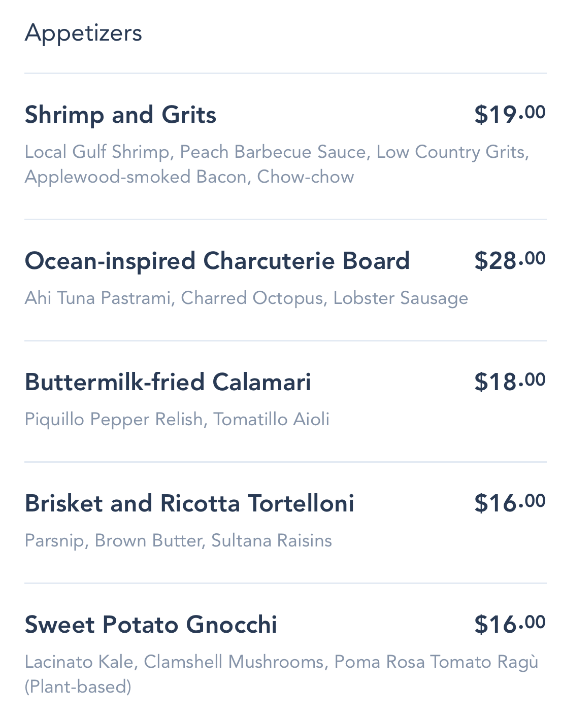 First up, we have appetizers that include Shrimp and Grits, and an Ocean-Inspired Charcuterie Board.