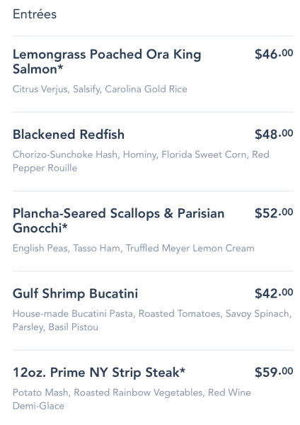 I have to agree with the others. There is nothing on that menu that I would want to eat. I like fish, but none of those appeal to me. And the other choices are too expensive.We always ate at Narcoosees when in Disney and they’d always had very good food.I guess we will skip it in the future .