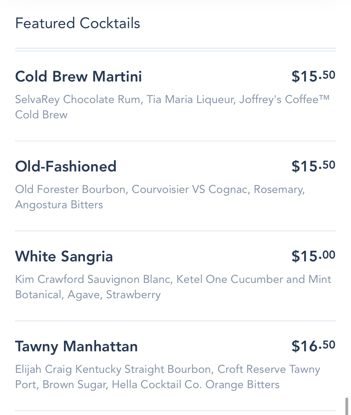 This is the problem with a lot of restaurants at Disney. The options are limited. It’s nice to be creative and offer dishes you would not normally get at other restaurants but at least have some simple dishes for those that are picky eaters. My husband is a basic meat and potatoes fan, while I like something a little different. I would have to eat here by myself. Not even a basic caesar salad on the adult menu.