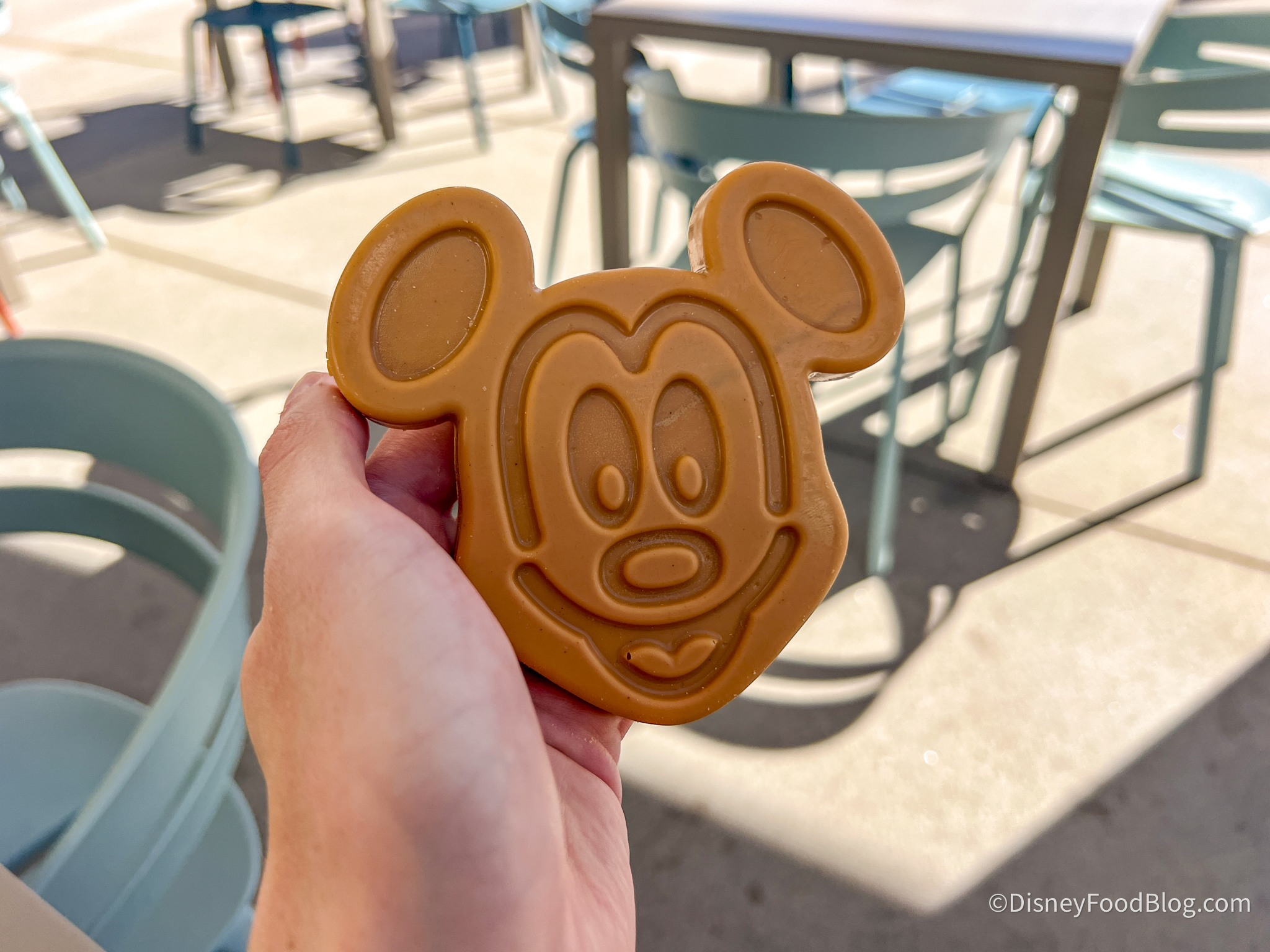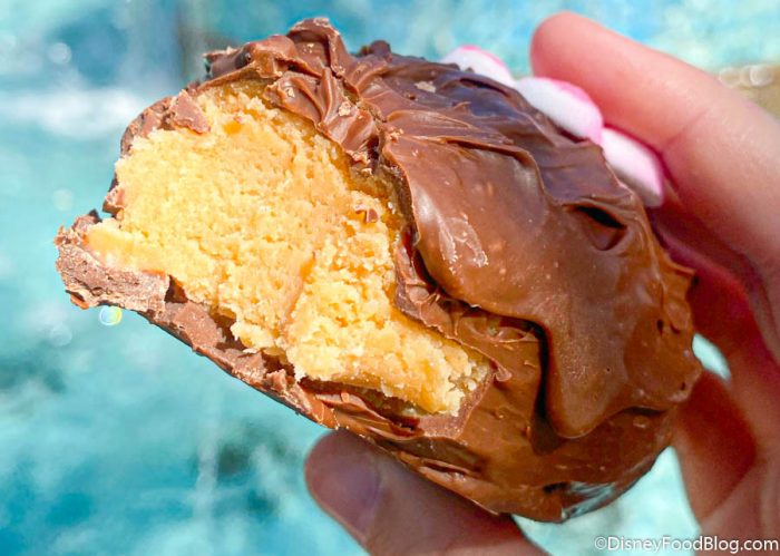 OH, and BRACE YOURSELF for THIS new treat… World of Sweets has NOW started selling Peanut Butter-Flavored Mickey Waffle Treats! This is — quite literally — just one big piece of Mickey Waffle-shaped peanut butter. The peanut butter’s flavor is sweet and smooth without being too rich or artificial tasting. Honestly, it reminded us a lot of the sweet peanut butter flavor you’d get inside of a Reese’s Peanut Butter Cup or Reese’s Pieces!