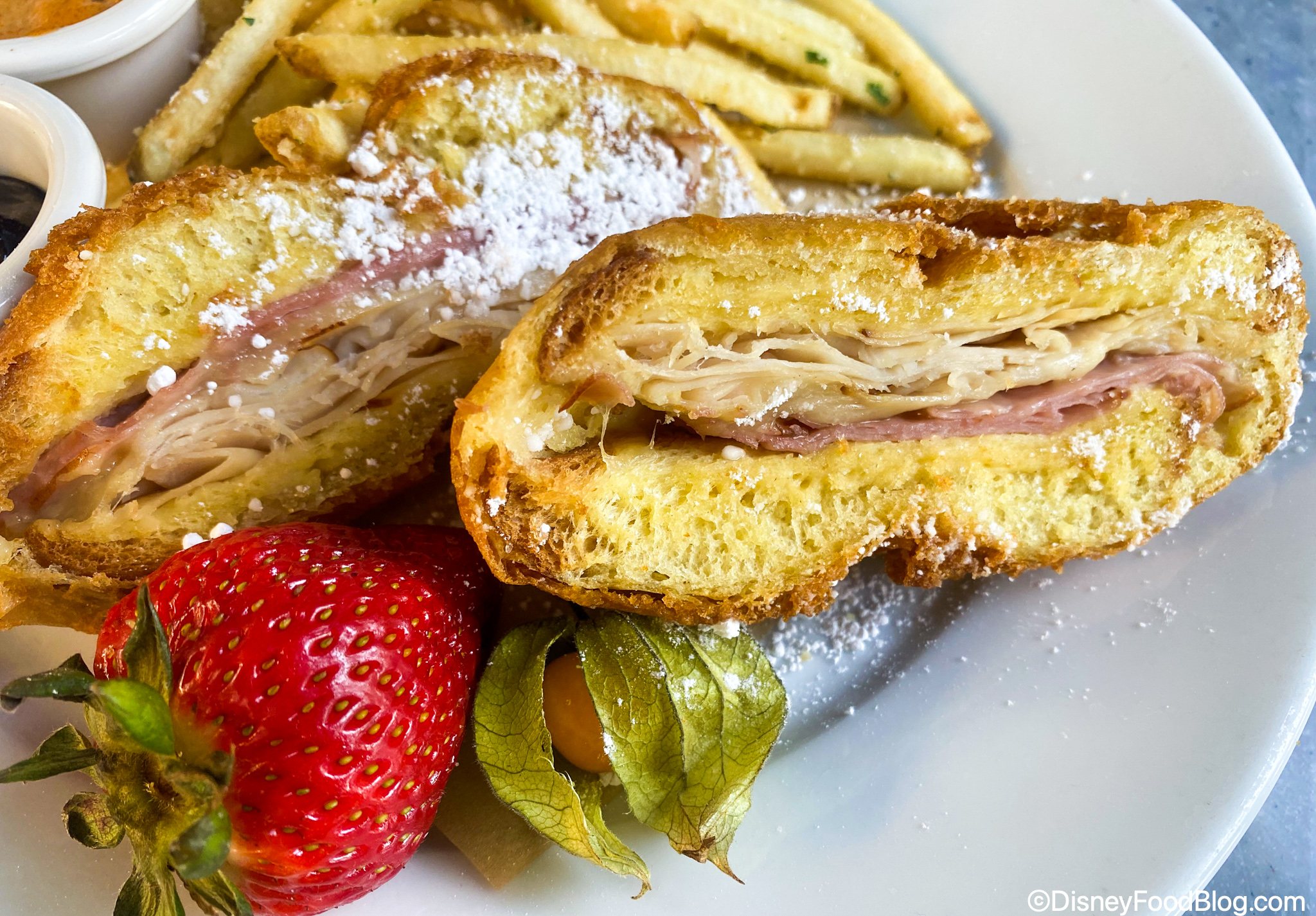 We’re already back at Disneyland’s New Orleans Square to celebrate the can’t-miss Monte Cristo Sandwich at Café Orleans! We’re talking about a sliced turkey, ham, and Swiss cheese sandwich, which sounds pretty basic… until, that is, you consider that it’s BATTERED and FRIED, then sprinkled with powdered sugar and served up with seasonal preserves!