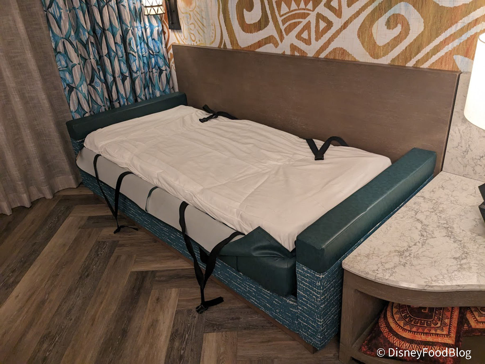 The couch has adorable Moana-inspired cushions, plus it comes with a handy tag showing instructions on how to convert it into a bed.