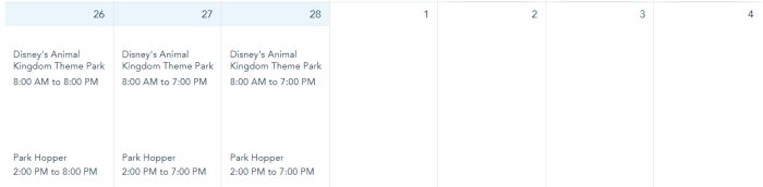 Park hours for Animal Kingdom are from 8AM-8PM on February 26th-27th, from 8-7PM on February 28th…