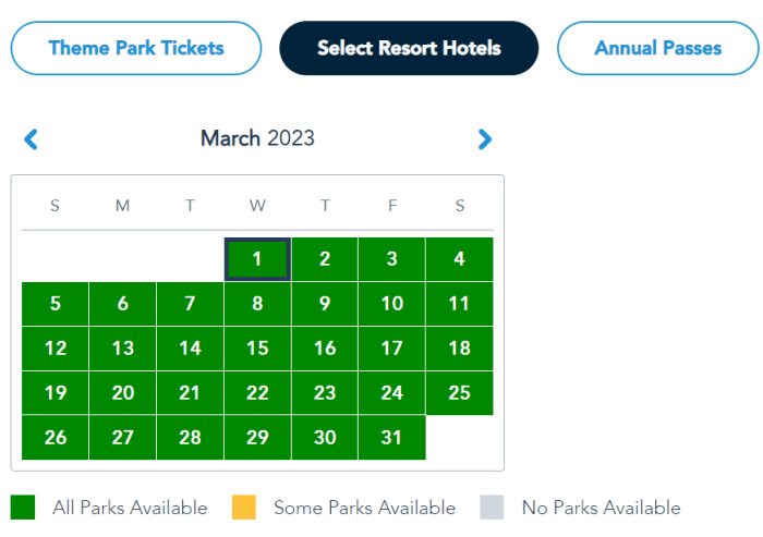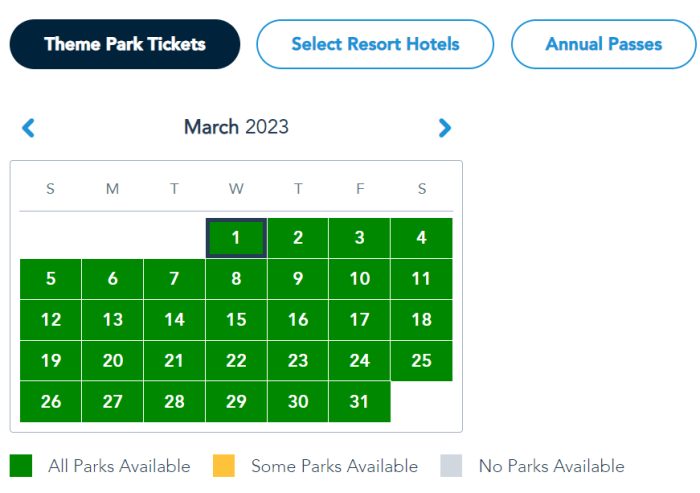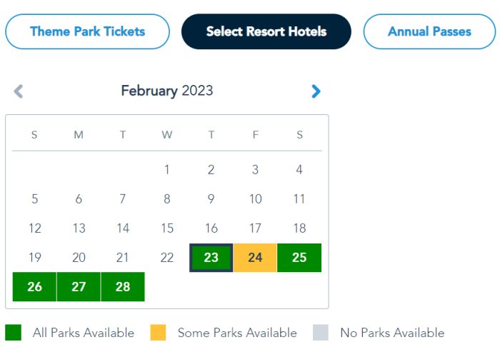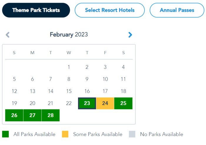 Park pass reservation availability is dependent on if you’re a guest with theme park tickets, a Disney World hotel guest, or if you’re an Annual Passholder. For visitors with Theme Park Tickets, all four parks are available on February 26th-28th.