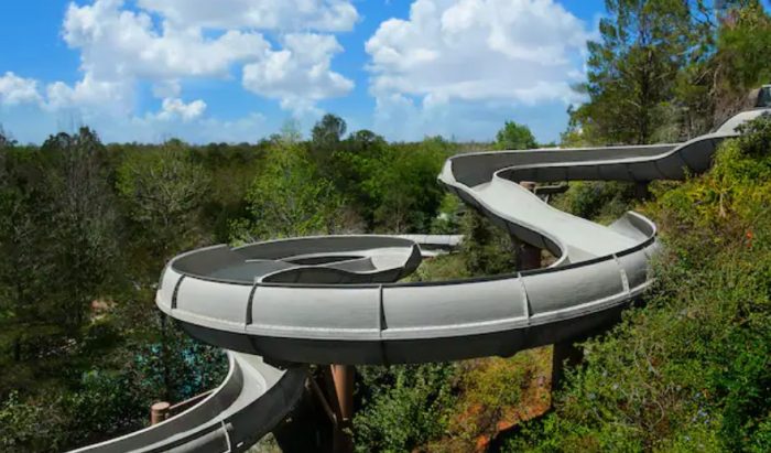 Legend has it a massive snowstorm hit Orlando and locals built a ski resort to take advantage of the unexpected weather. The storm left as quickly as it began, the ice and snow melted, and we were left with Blizzard Beach. This is why you’ll se plenty of snow-capped mountains, ski chutes, and even a chair lift!