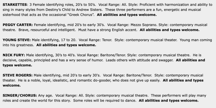 Disney is holding auditions for the Starkettes, Peggy Carter, Young Steve Rogers, Nick Fury, Steve Rogers, and Singer/Chorus roles! You can check out the full details of the casting call below: