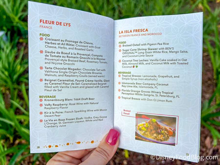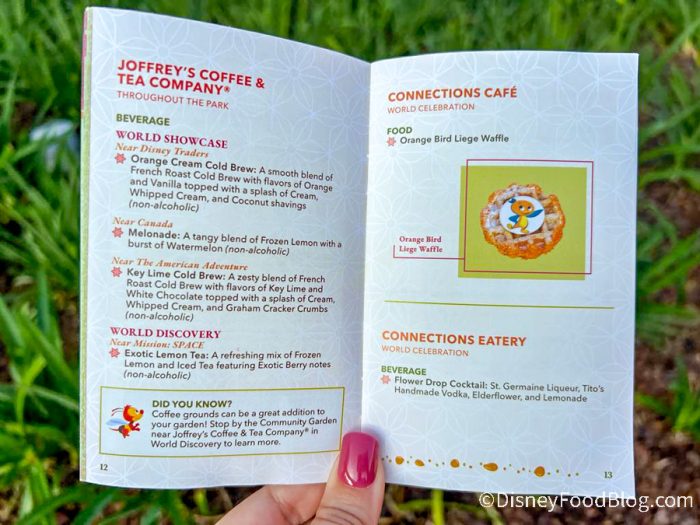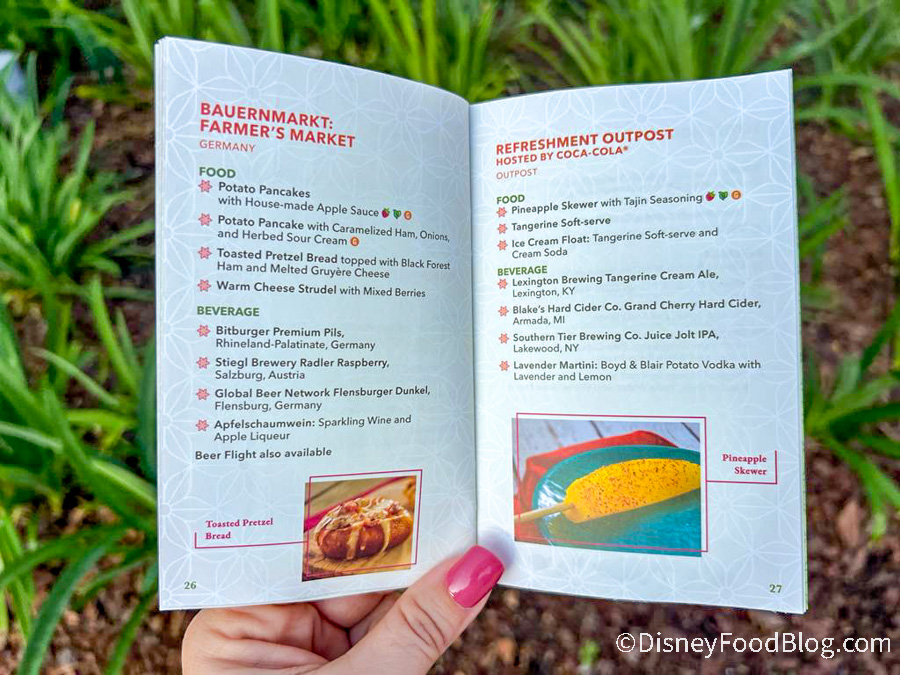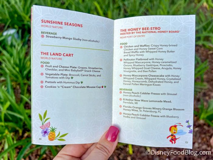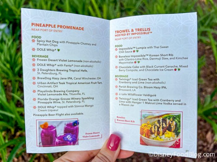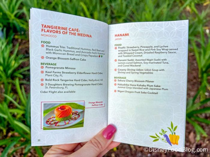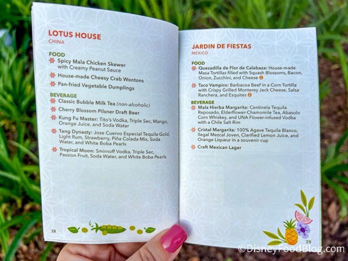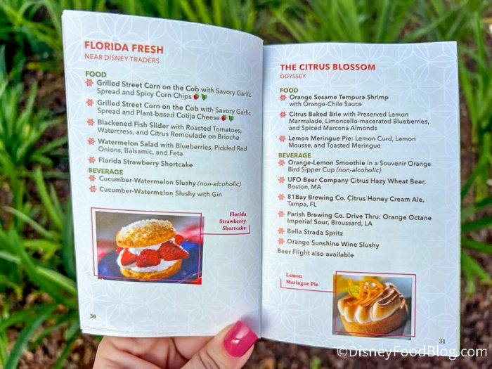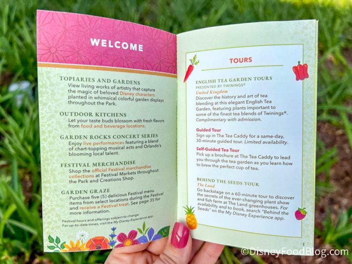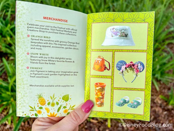 When you enter EPCOT, you’ll be able to pick up this special festival passport, which is a booklet that acts as your guide to the festival. We grabbed a copy of the passport when we walked into the park and the cover is just as vibrant as the festival! It’s giving strong citrus vibes, with shades of green, orange, and yellow, and a bouquet of fruit, flowers, and veggies exploding from behind the logo.