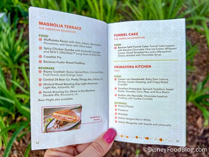 If you love live music you don’t want to skip the Garden Rocks Concert Series. Held at the America Gardens Theatre, there are three shows on concert nights and you can scan the QR code to see which artists are coming (or check out our page here!). This page also tells you about the Festival Gift Cards. These are a great way to budget because it’s easy to run up a hefty sum visiting the food kitchens! Gift cards are a handy way to set a limit (although they are reloadable), plus they come with a wristband for easy access. Lastly, this page has the key for the food kitchen guide, which means …