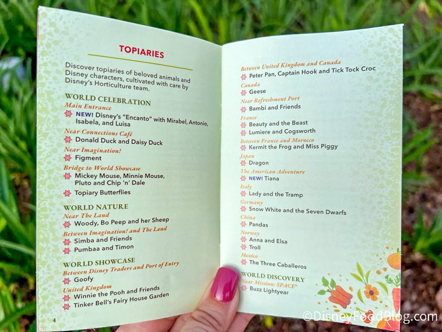 Your festival passport will also tell you what topiaries you’ll see and where to find them. It’s easy to get caught up in all of the festival attractions that you just might miss them, so this is extremely helpful for finding your favorite characters.