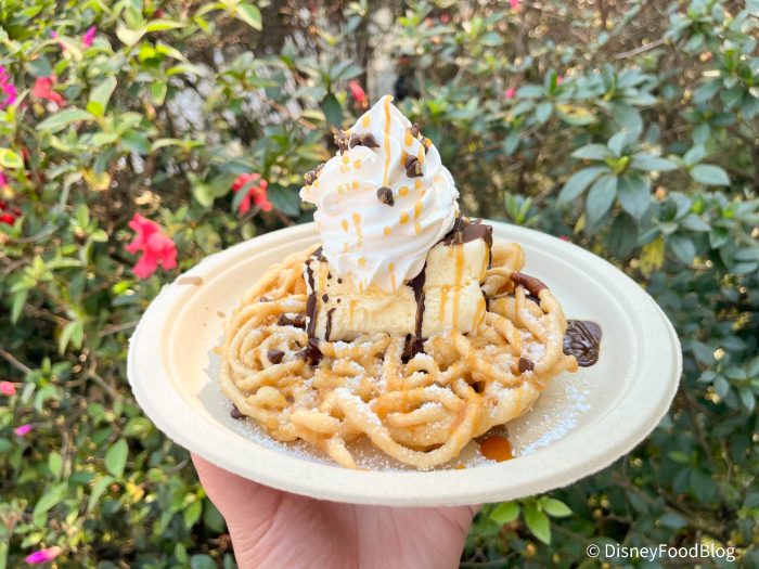 This favorite EPCOT spot is serving up a new dish called the Cold Fudge Funnel Cake. Yeah, we were a little intrigued by the name too! This funnel cake is being served as part of Celebrate Herstory, Disney’s celebration of Women’s History Month. This classic funnel cake is topped with chocolate-dipped vanilla ice cream, whipped cream, caramel, and chocolate chips and can be purchased for $9.50.
