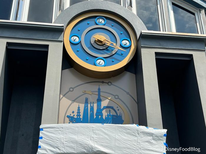 There’s still a portion of the façade that is covered, but now we can see some pretty snazzy new decorations! Below the clock feature, there’s a skyline of Tomorrowland that includes several of the area’s attractions. The clock itself has lightning bolts for hands but doesn’t appear to be ticking at the moment.
