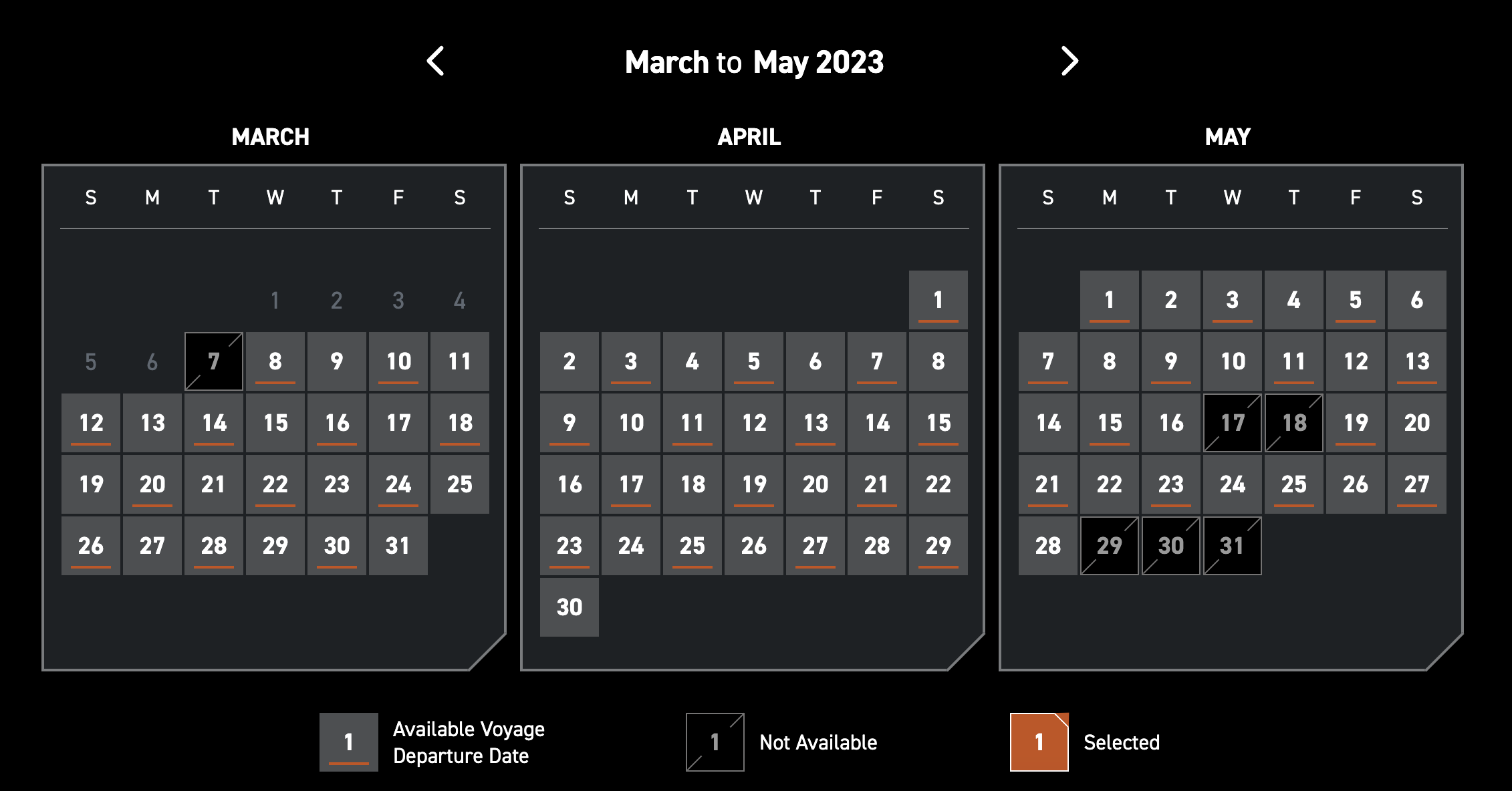 I was just on the site today and they had 3/4 “voyages” per week March – May, with some voyages unavailable, which I assume means they are booked.