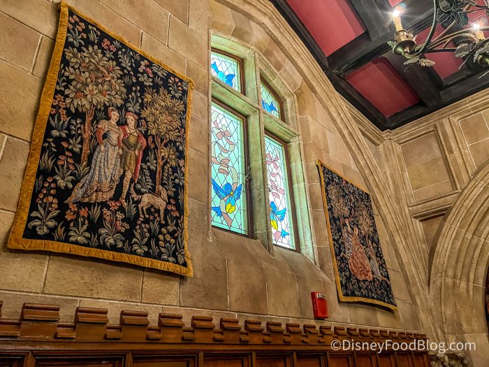 You’ll find incredible theming and decor throughout the restaurant, making you really feel like you’re inside a castle. The stone walls are adorned with tapestries and art, while the windows feature gorgeous stained glass. If you look up, you’ll notice opulent chandeliers and even more decor.