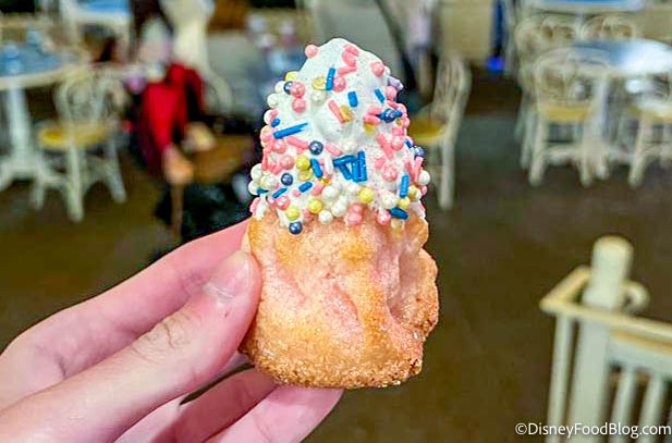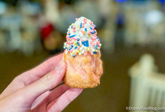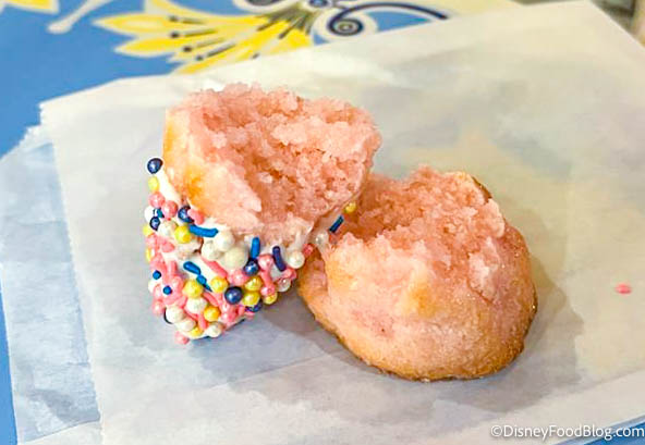 If you’re a Disneyland regular (or Disneyland snack aficionado), you may already be familiar with the ever-popular Matterhorn Macaroon, but this is a DIFFERENT treat thanks to its raspberry flavoring and sprinkles.