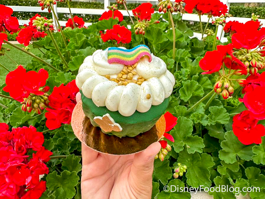 Over at this Deluxe Resort, The Artist’s Palette is a quick-service restaurant that usually serves some fun and creative cupcakes, so when we saw this Mickey Pot of Gold cake we had to check it out! This is a Stout-Chocolate Cake filled with Irish Cream Mousse dipped in a Chocolate Shell with buttercream, gold sprinkles, and a rainbow gummy.