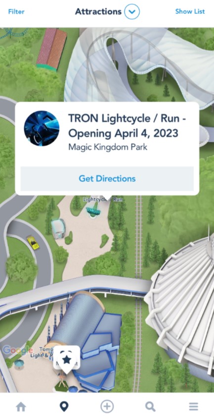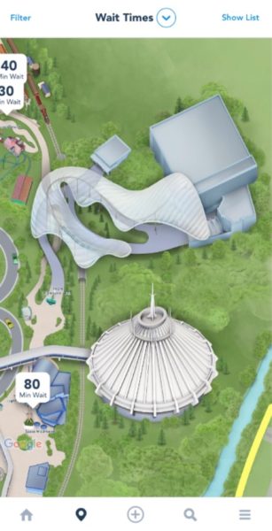 The coaster and its instantly recognizable sweeping canopy are included on the digital map of Magic Kingdom. They even included the massive, glowing sign right outside the entrance!