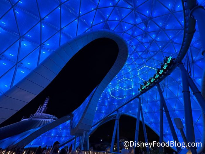 We think the ride should still be cool either way, but when we’ve seen those light panels tested at NIGHT, they’ve looked SO vibrant. It turns out the TRON coaster canopy doesn’t just light up blue. It can also display a wide range of different hues too (that we’re HYPED to see put into action while riding it ourselves)!