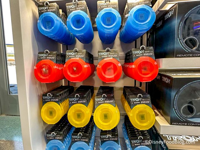 Whew — what a day for TRON news! In the past few days, we have reported on the FULL MENU for the TRON snack cart, the NEW interactive TRON experience, and even some of the upcoming TRON merchandise! Now we have a NEW LOOK at a ton of TRON souvenirs!