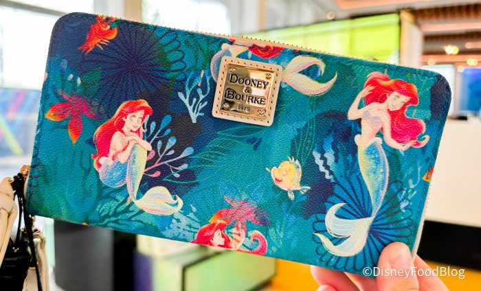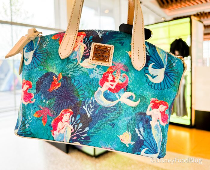 First, we saw this The Little Mermaid Dooney and Bourke crossbody bag for $248. Unfortunately, this style is sold out online but check to see if it’s still available in the parks. This one comes with a crossbody strap, gold hardware, and an all-over Ariel, Flounder, and Sebastian print.