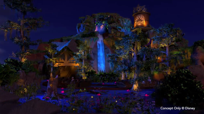 Disney shared that concept art (above) with a photo of Tiana and her group in front of the water tower, but also shared some concept art of what it’ll look like in the park during the day…