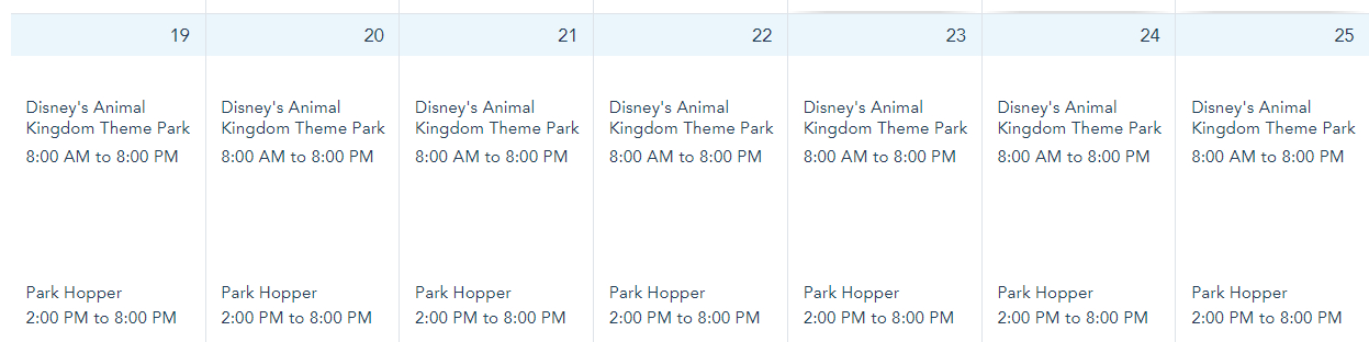 Park hours for Animal Kingdom are from 8AM-8PM on March 19th-25th.
