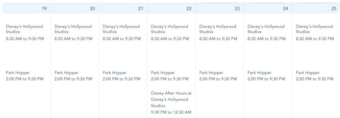 Hours for Hollywood Studios are from 8:30AM-9:30PM on March 19th-25th.