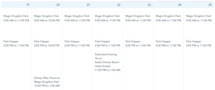 Magic Kingdom is open from 9AM-11PM on March 19th and March 21st-25th. The park is open from 8AM-10PM on March 20th.